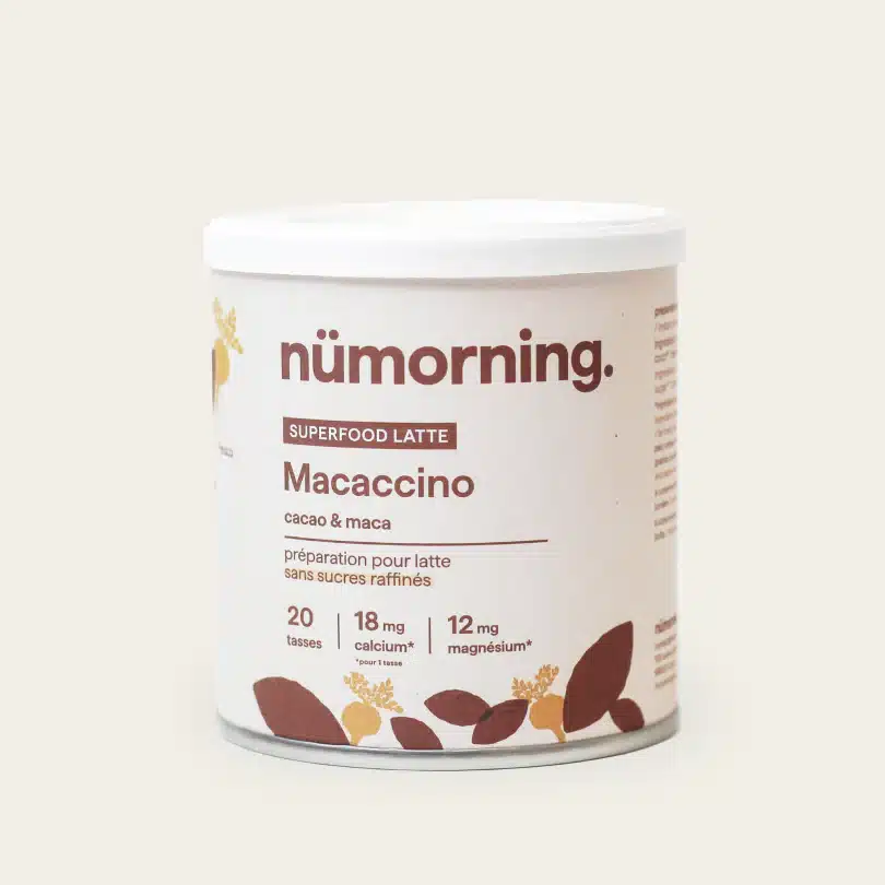 Découvrez « Macaccino » en 125g de Nümorning, un chocolat en poudre bio au cacao intense équilibré par la douceur naturelle du sucre de fleur de coco.